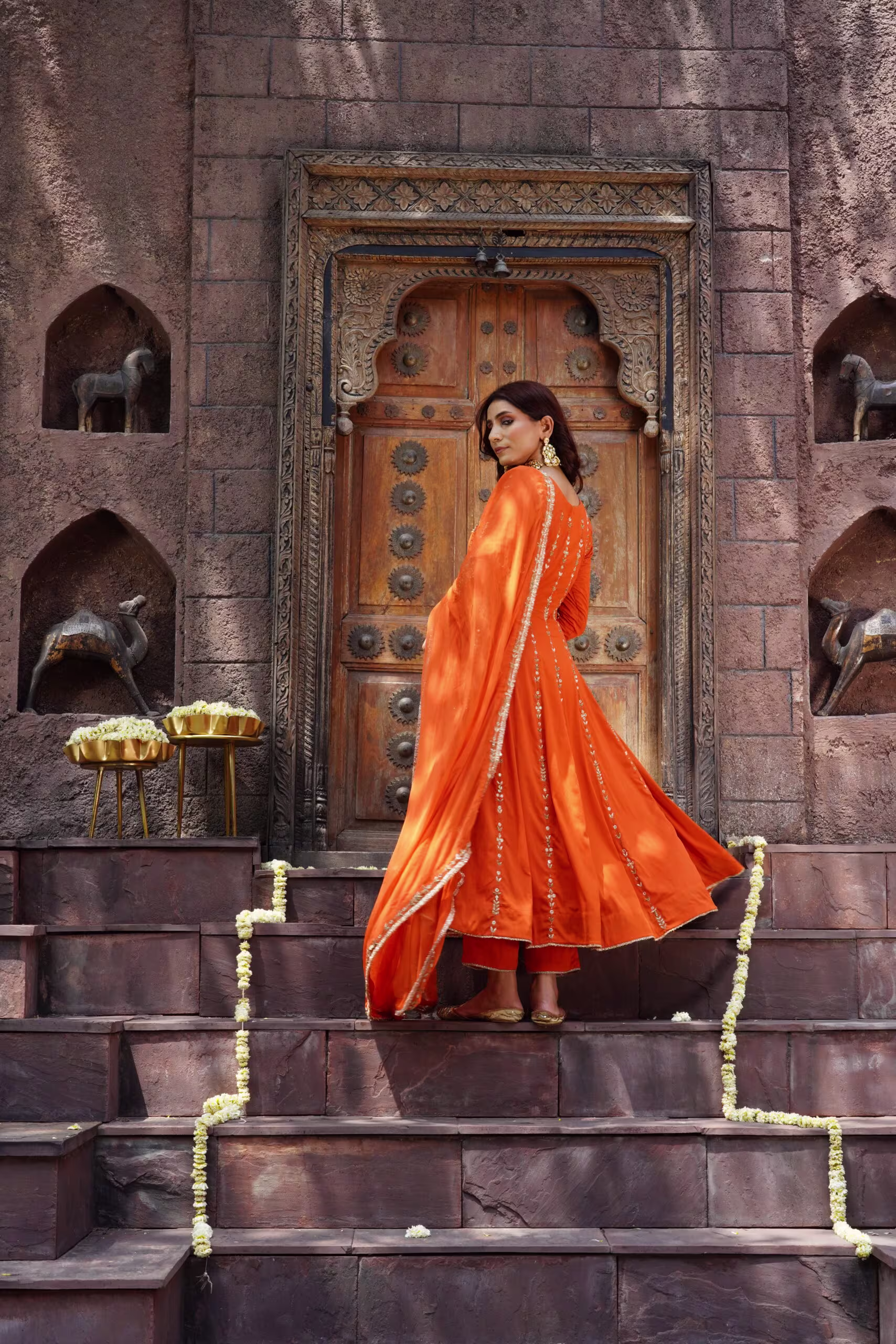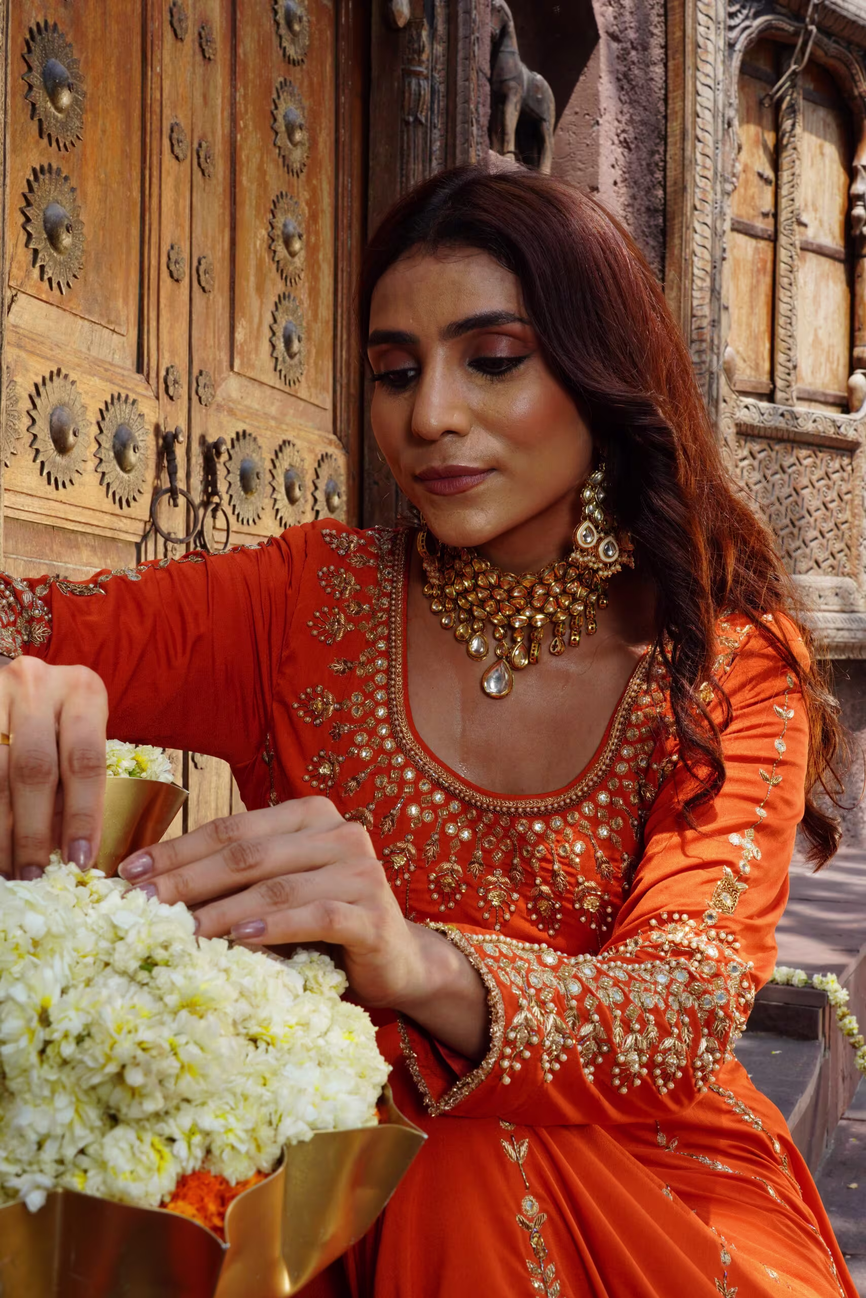 Kash is a vibrant tribute to the spirit of celebration — drenched in a fiery saffron hue that symbolizes joy, courage, and deep-rooted tradition. The exquisite hand embroidery dances across the fabric like sparks of festivity, creating a visual rhythm that’s both striking and soulful. Every thread feels intentional, echoing the essence of feminine power that’s been passed down through generations.