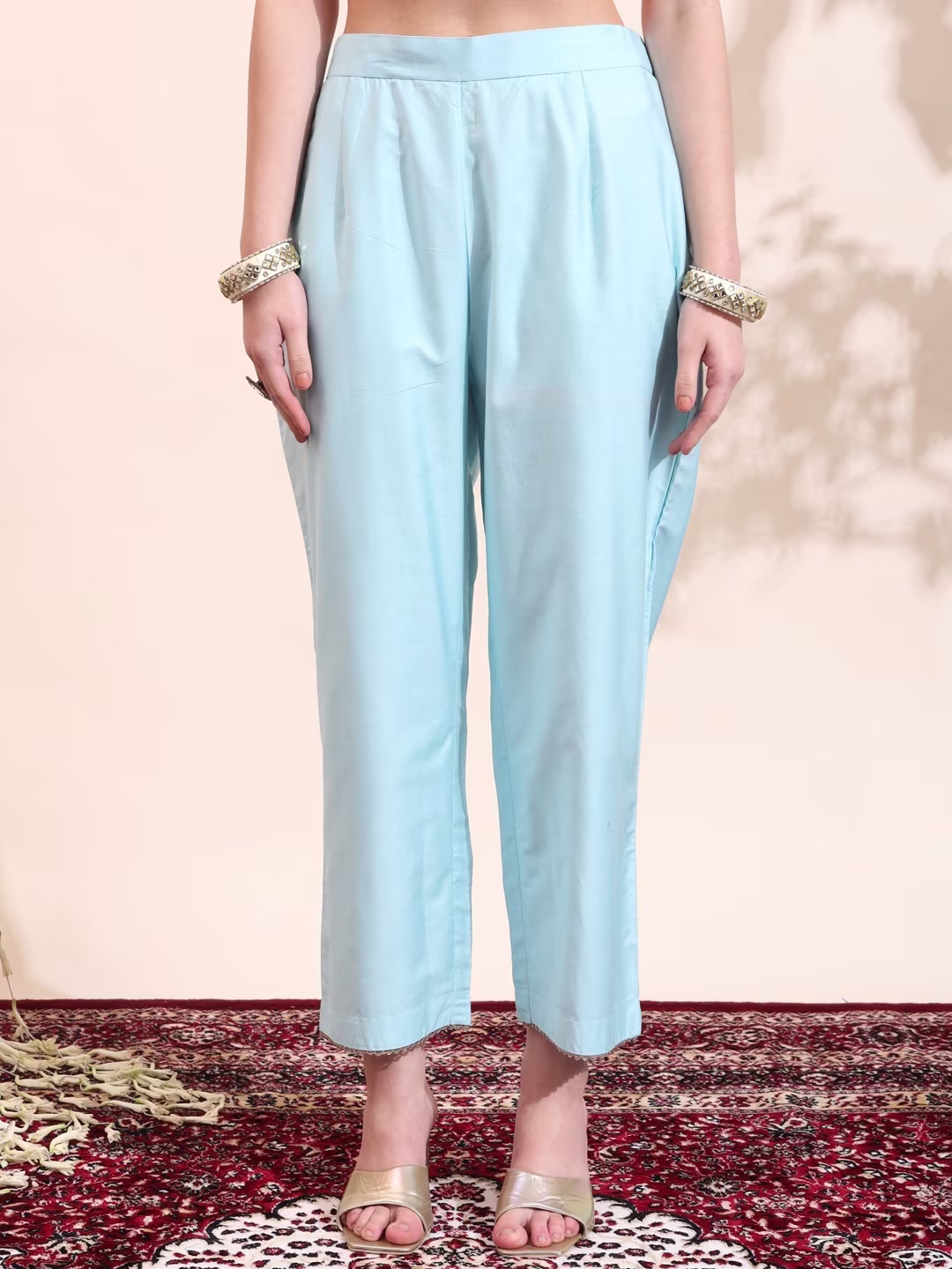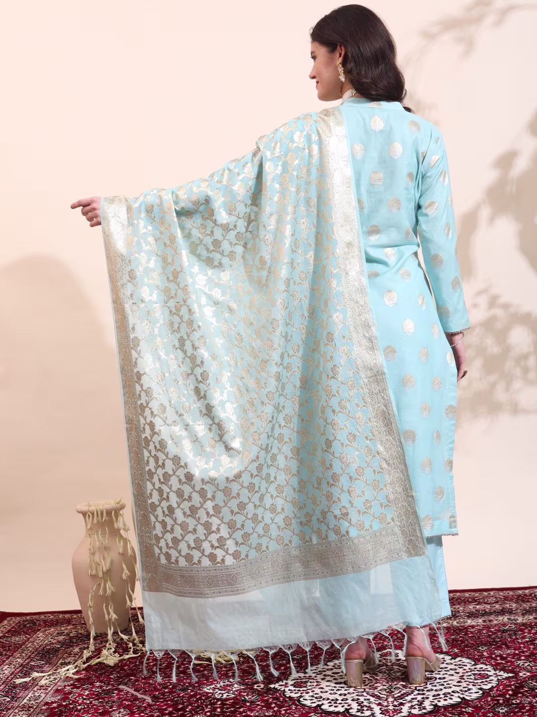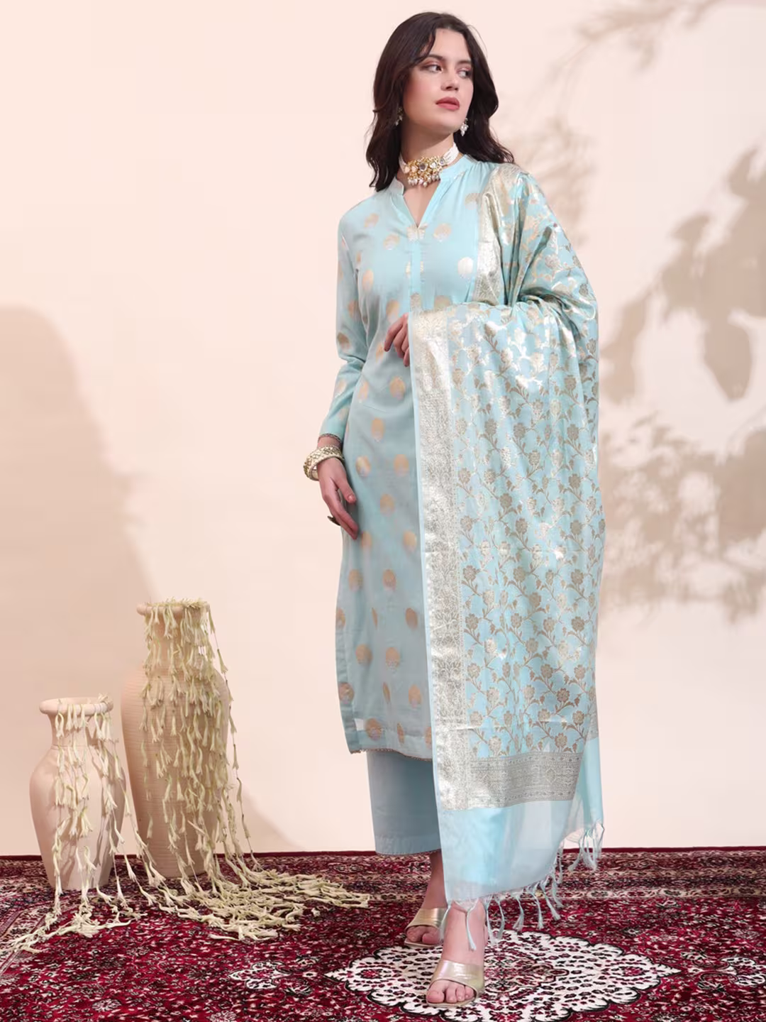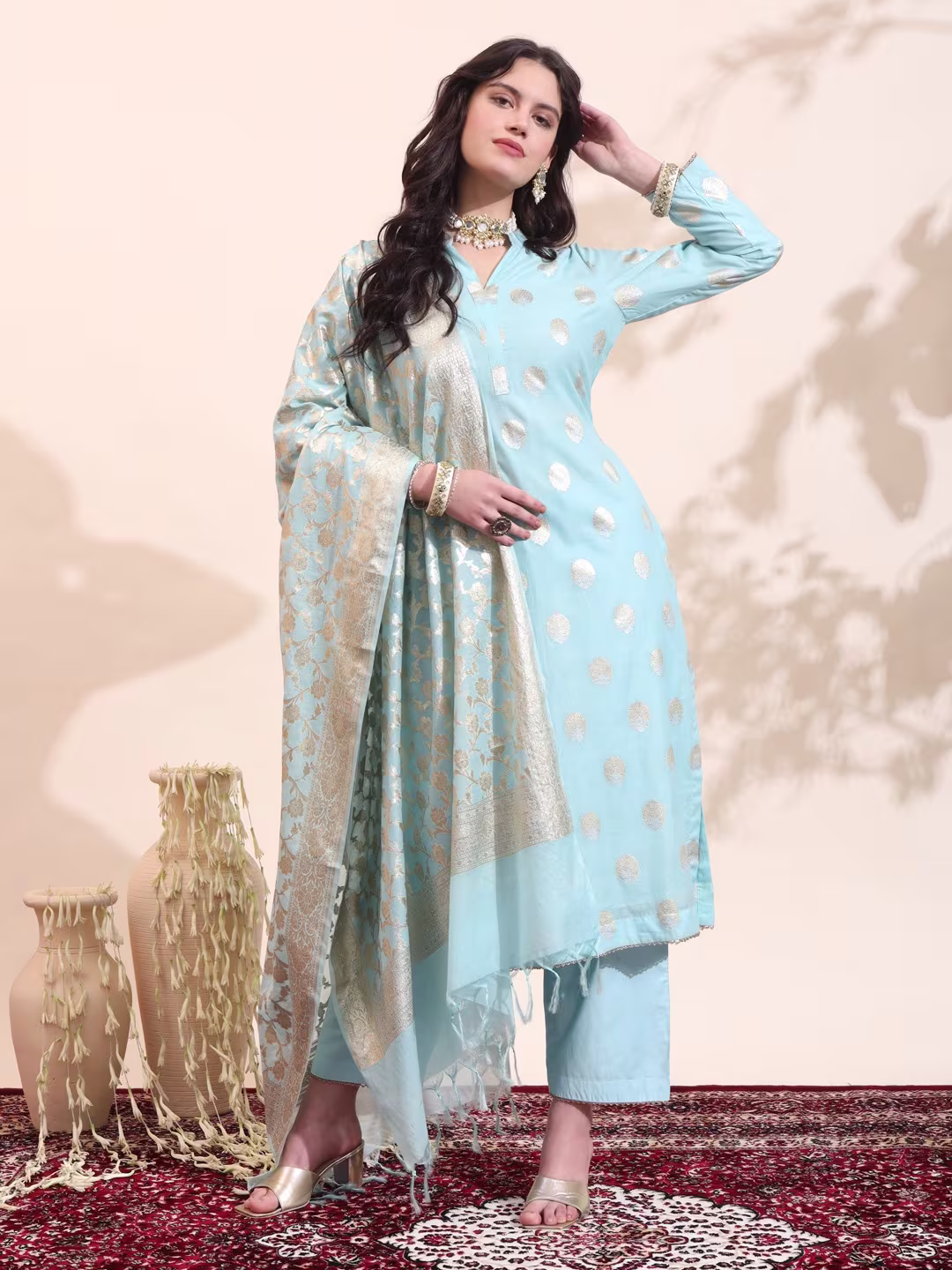 Unveil the allure of the night with our Readymade “Midnight Magic” set. This enchanting ensemble, draped in a deep, midnight blue, exudes elegance and mystery. The flowing flowery work, adorned with intricate Mat golden work, shimmers under the moonlight. Paired with sleek pants and a sheer, embellished dupatta, this set is perfect for a night of glamour.